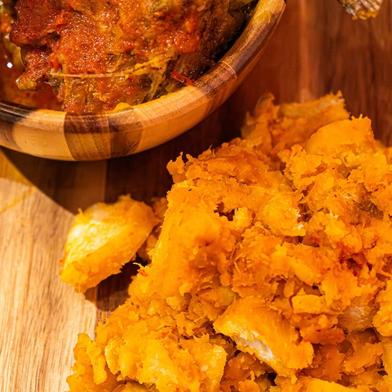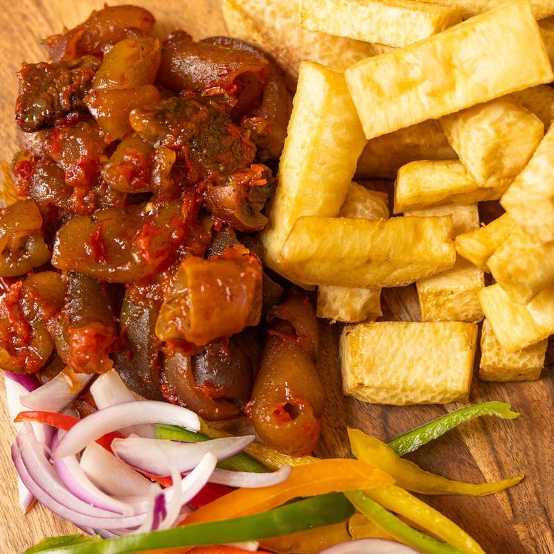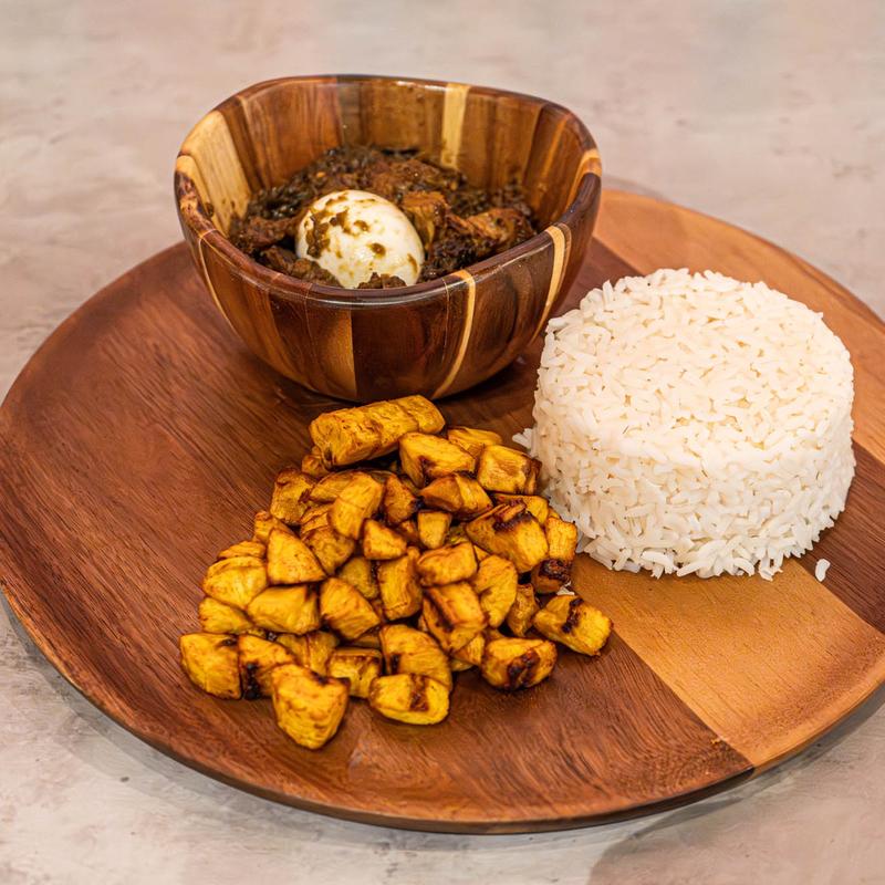 Creamy yam chunks immersed in flavorful African sauce, offered with your choice of protein, be it succulent assorted meat or an all-meat delight. It's a dish that embodies tradition and choice, warming both your heart and palate.